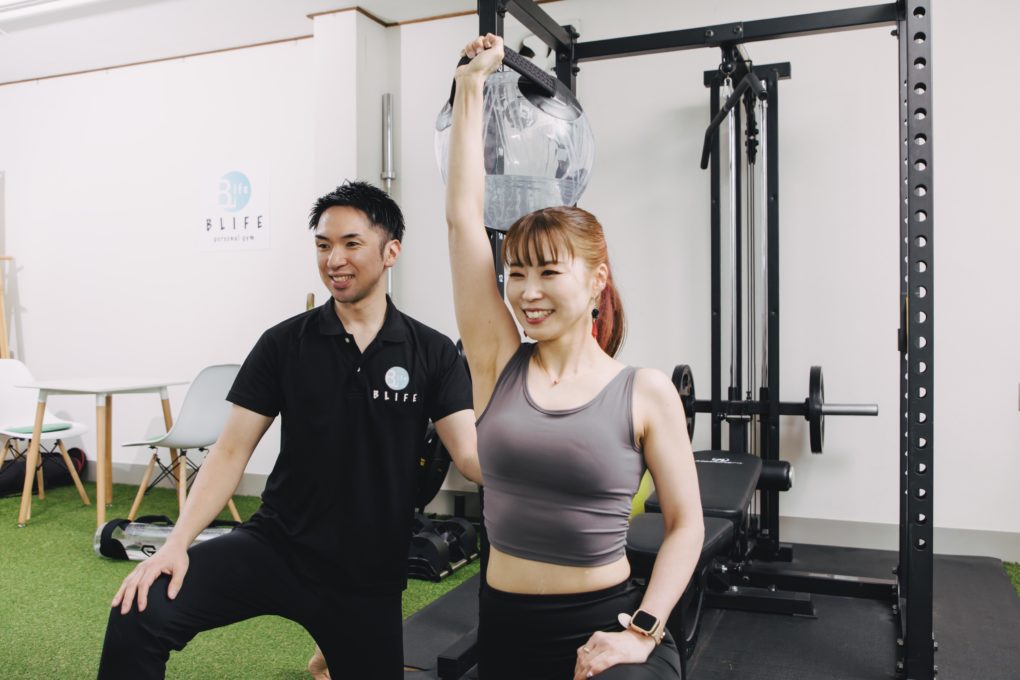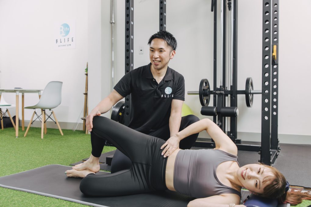 まずは身体の歪みを改善させる運動からスタート、これによりトレーニング効果を上げてボディメイクをしていくパーソナルジムBLIFE(ブライフ)。