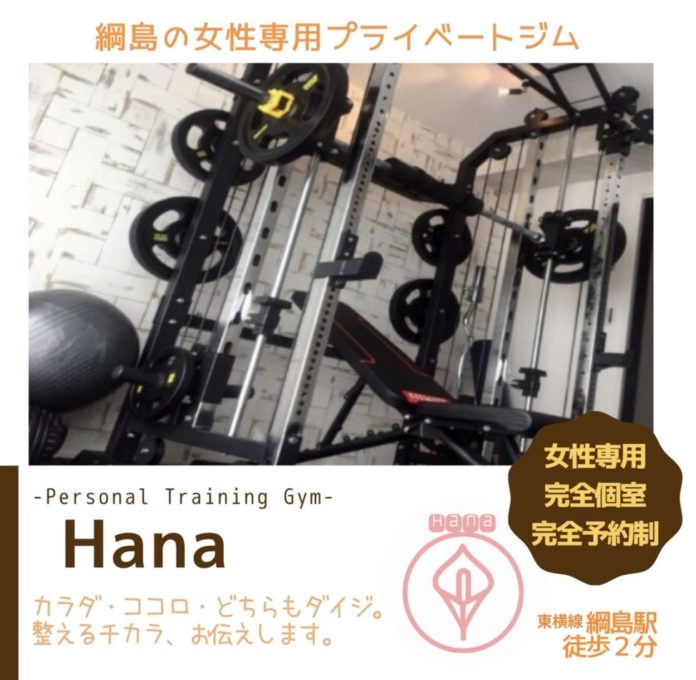 店舗名 Hana(ハナ)-綱島の女性専用プライベートジム- 住所 横浜市港北区綱島西1−2−9ゴールデンパーク202 営業時間 10:00〜22:00 定休日 不定休 電話番号 お問い合わせはメールにて可能 アクセス 綱島駅 徒歩2分 公式サイト https://hana-tr.co...