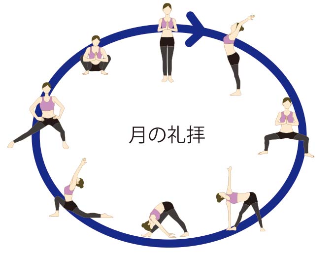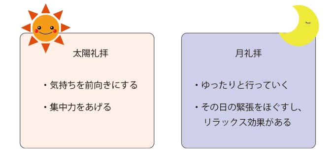 太陽礼拝が一日のはじめに太陽とともに動いていき、気持ちを前向きに、集中力をあげるのに適しており、月礼拝は一日の最後に、ゆったりと行っていくアーサナで、その日の緊張をほぐすリラックス効果があります。