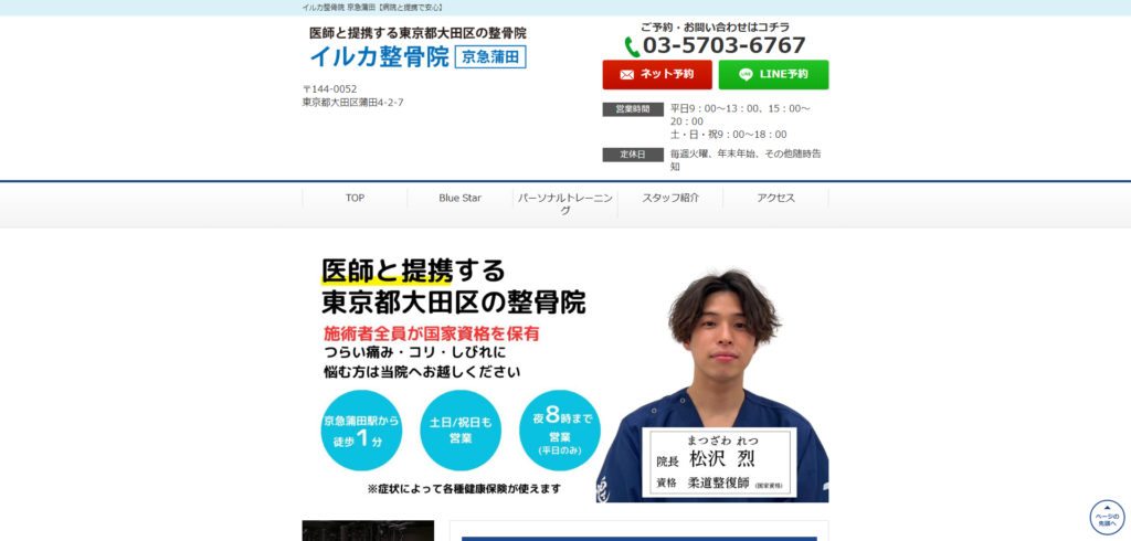 「イルカ整骨院 京急蒲田」は、東京都大田区蒲田にある整骨院で、JR「蒲田駅」から徒歩8分、京急「京急蒲田駅」から徒歩6分と通いやすい場所に位置しています。整骨院としての施術とトレーニングを組み合わせたサービスを提供しています。 料金プランは30分6,600円(税込)、45分9,900円(税込)、60分13,200円(税込)から。体験トレーニングは1,100円(税込)。営業時間は平日9:00~13:00、15:00~20:00、土日祝は9:00~18:00で、毎週火曜と年末年始が休業日です。