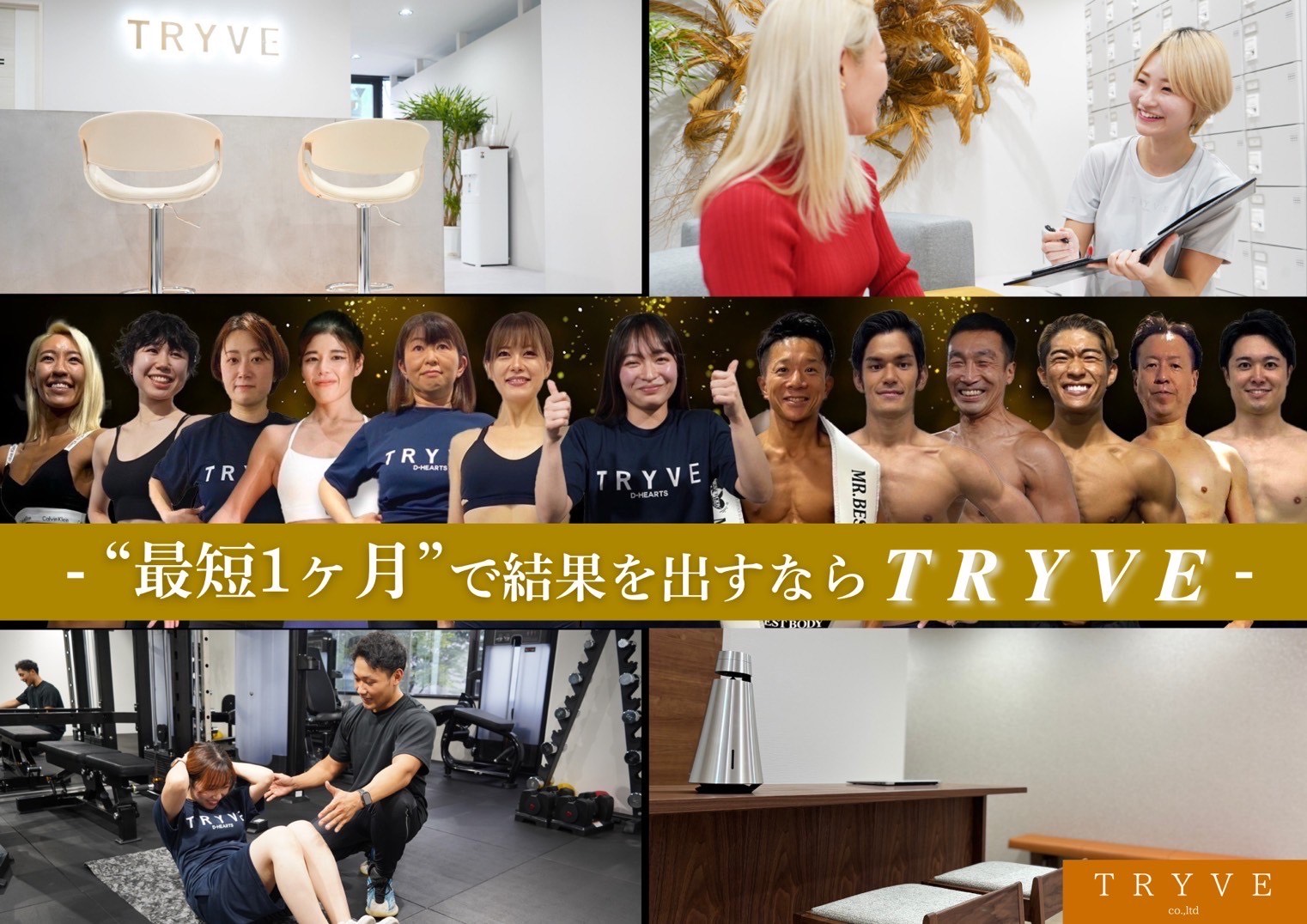 「最短1ヶ月で自分史上最高に美しいカラダヘ。」 私たちTRYVEは、“結果”を求めるすべてのお客様のために存在します。「ダイエット・ボディメイク」に必要なモノをすべて取り揃えたラグジュアリーな空間で、最高品質のトレーニングを提供致します。
