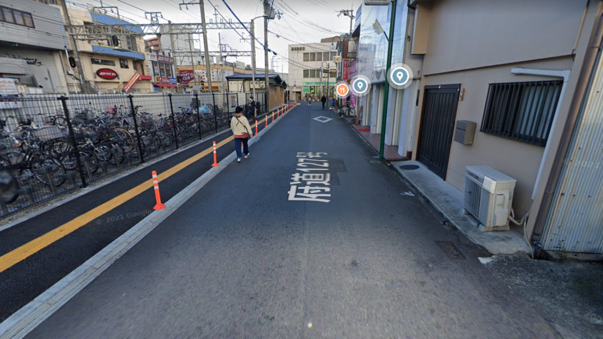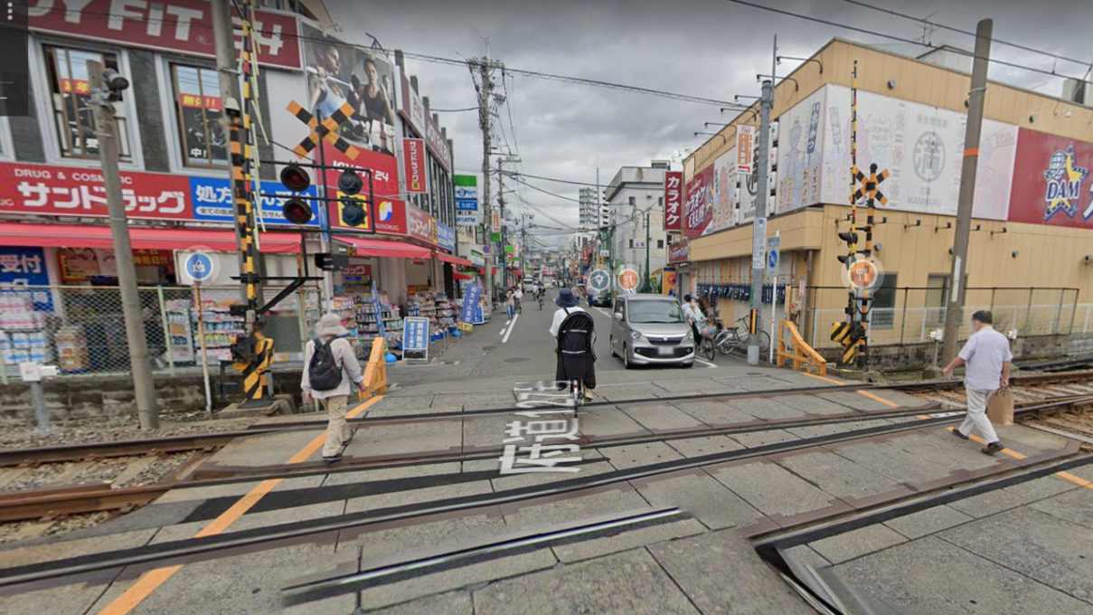 富田駅南口を出て駐輪場のある線路添いに踏切まで直進します。