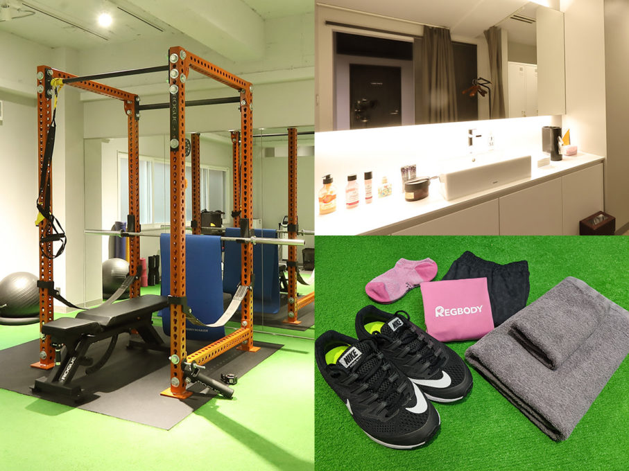 REGBODY(レグボディ)ではトレーニングウェアやシューズ、タオルなどレンタルサポートも充実しています!トレーニングに必要なものは揃っているので、お仕事帰りに身軽に通うことができて便利です♪また、清潔感が漂うシャワー室やゆったりとしたラウンジ、女性専用のメイクルームも設置されているので、トレーニング後はリラックスして過ごすことができます。