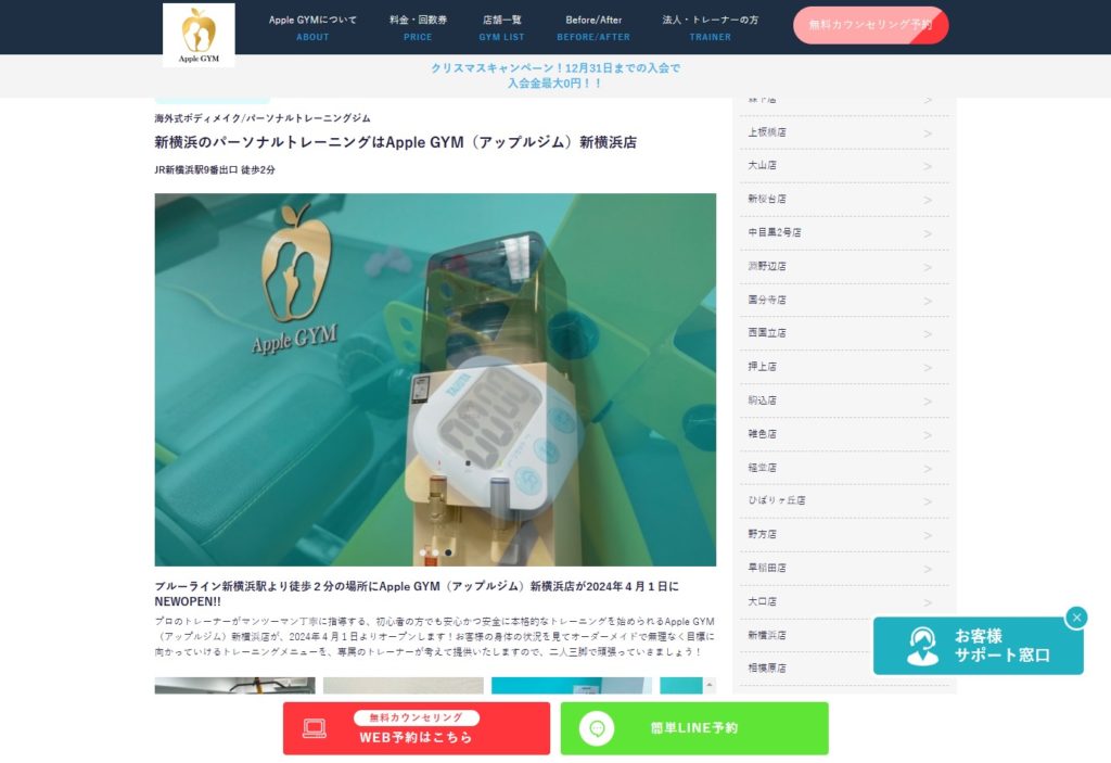 Apple GYM(アップルジム)新横浜店は、JR新横浜駅9番出口から徒歩2分の好立地に位置するパーソナルトレーニングジムです。専属トレーナーによるマンツーマン指導で、初心者の方でも安心してトレーニングを始められます。完全個室のトレーニングルームや更衣室を完備し、プライバシーに配慮された環境です。オリジナルプロテインの販売や、無料のウォーターサーバーも設置されています。営業時間は9:00から21:25までで、仕事帰りにも通いやすいのが特徴です。初回の無料カウンセリングも提供しています。