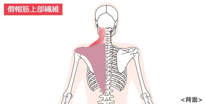 頭蓋骨の後ろ、後頭部の辺りから鎖骨の内側まで走っている筋肉。首をすくめる動き(肩甲骨の挙上)、腕を斜め上に挙げる働き(肩甲骨の情報回旋)のときに使われる筋肉です。