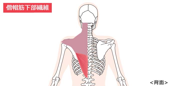 みぞおちの裏あたりの背骨から始まり、肩甲骨まで付着している筋肉です。肩を落とす動き(肩甲骨の下制)やうげを斜め下に引く動き(肩甲骨の下方回旋)に使われます。