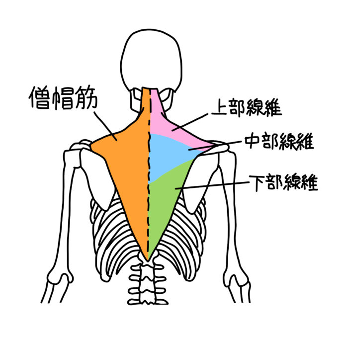 僧帽筋は上部繊維、中部繊維、下部繊維の3つから構成されています。この上部繊維、中部繊維、下部繊維についてそれぞれを少し知っていきましょう。