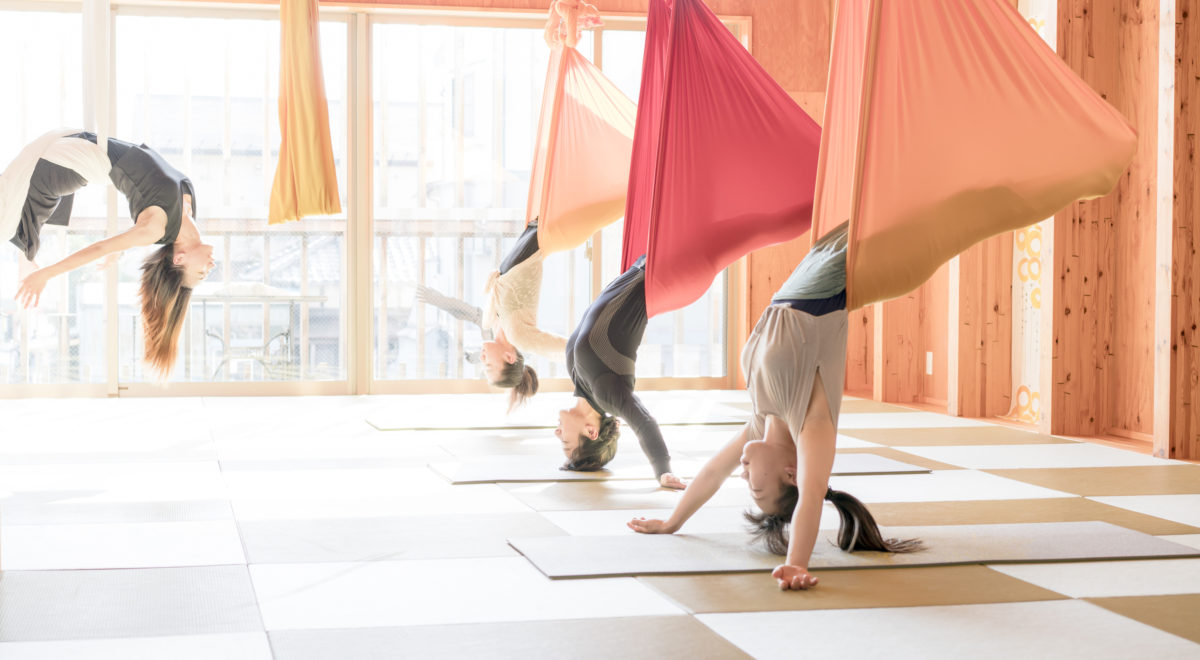 レッスンの種類は基本のエアロヨガ、エアリアルなダンスが楽しめるエアロフロークラス、初心者から中級者までプチシルク・ド・ソレイユが体験できるエアロシルク、ゆっくりとした動きで呼吸を重視したエアロスローヨガ、さらに逆さにならない空中でのマインドフルネス瞑想の繭のひとやみと5種類あり、初心者から上級者まで楽しめます。