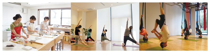 ヨガは発汗量小のコースから発汗量大のコースまで様々なレッスンがあり、エアリアルヨガも初心者から上級者までクラスが分かれているので初心者にも安心です。初回の体験はヨガのみで2,200円、料理とヨガの両方で3,200円と材料費で受講する事ができます。さらにエアヨガは3,000円で体験する事が可能です。