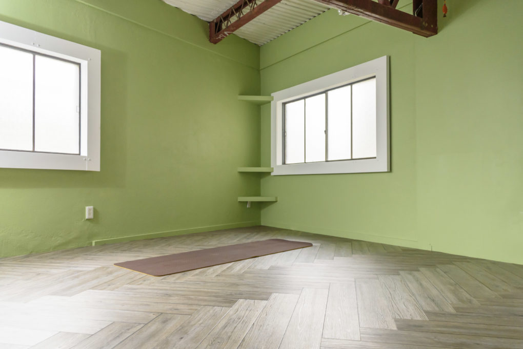 阪急千里山駅より徒歩3分のところにあるメイヨガスタジオです。ナチュラルなグリーンの壁紙が印象的な開放感溢れるスタジオです。