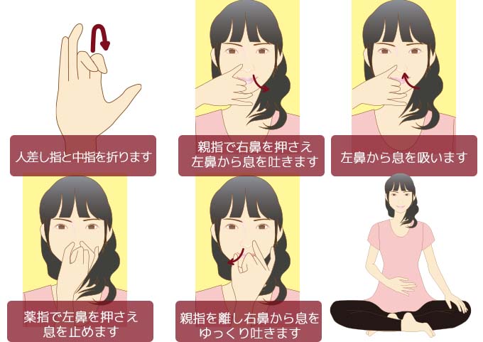 まず左の鼻腔から吸って、指を入れ替えて右から吐く、そして右から吸って抑える指を入れ替えて左から吐きます。
