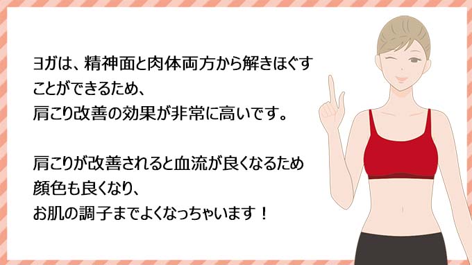 ヨガをすると心身両面から解きほぐすことができるため、肩こり改善の効果が非常に高いのです。