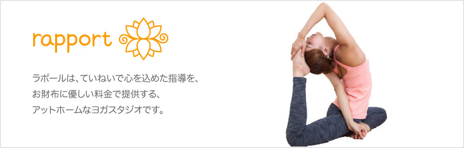 ラポールとはほのぼのした・相互の間の調和という意味で、人は糸でいろんな物事とつながっていると考え、その繋がりをヨガを通して安定的に結べるようにと始まったヨガスタジオです。
