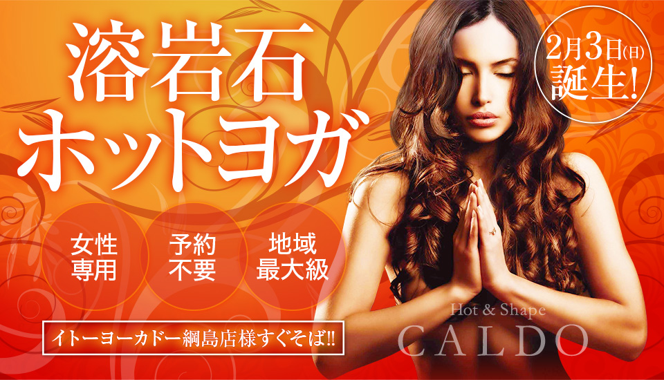 綱島駅西口徒歩5分、イトーヨーカドーのすぐそばにある溶岩石ホットヨガカルド綱島店。カルドの魅力はレッスンの事前予約が不要で、地域最大級の女性専用スタジオということ。こだわりの溶岩石を使った最大収容人数50名という広々としたスタジオで、室温40度湿度55%を保ち身体を内側から温めてくれます。